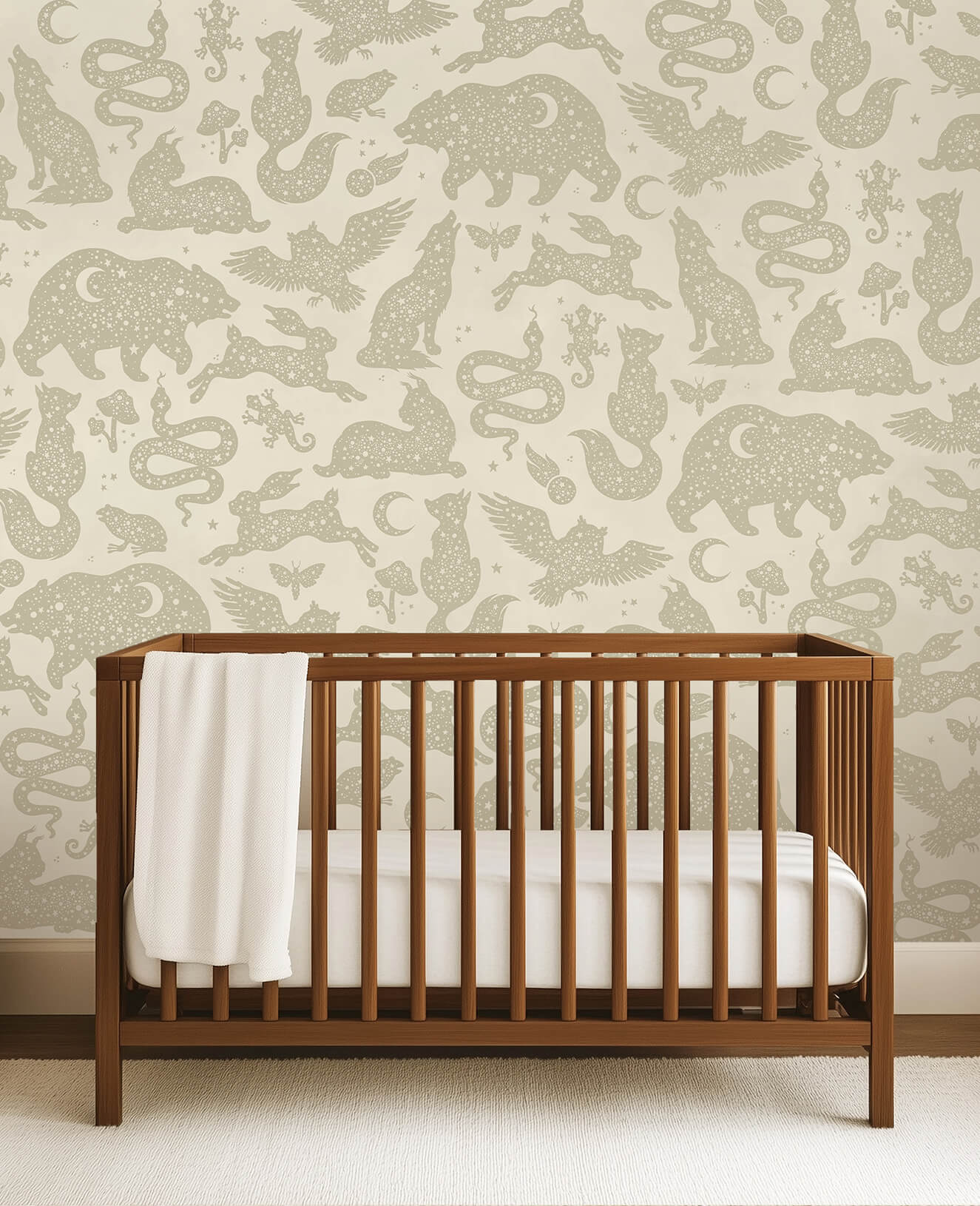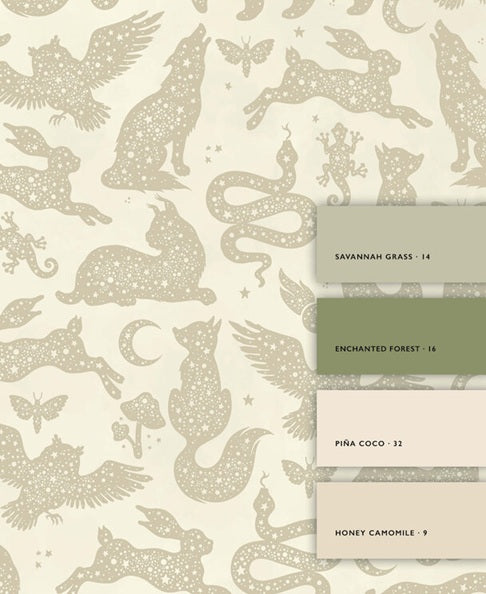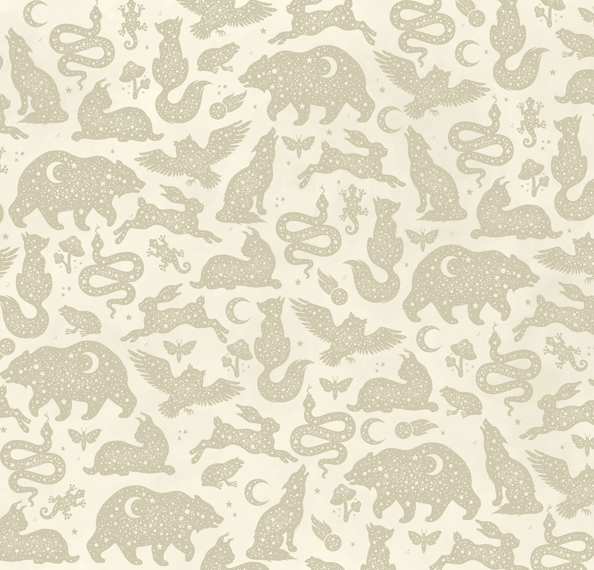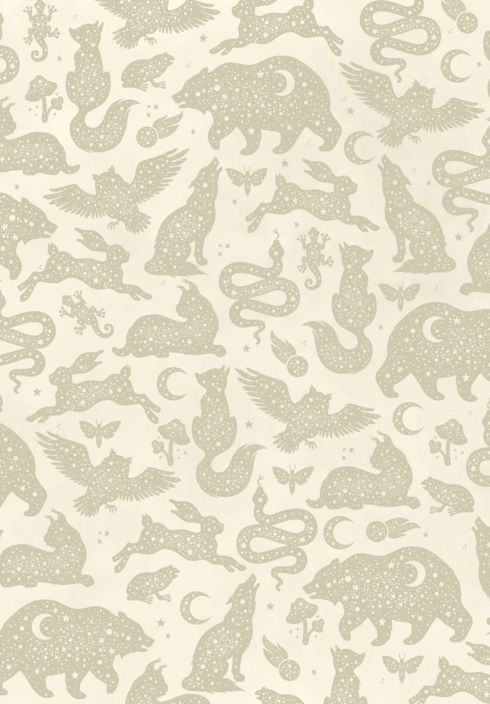 Starlight is een prachtig dierenbehang van Creative Lab Amsterdam voor de kinderkamer! Silhouetten van dieren over de hele muur met daarin een mooie sterrenhemel op een neutrale beige achtergrond. Hazen, slangen, wolven, uilen, alle (nacht)dieren komen tot leven!