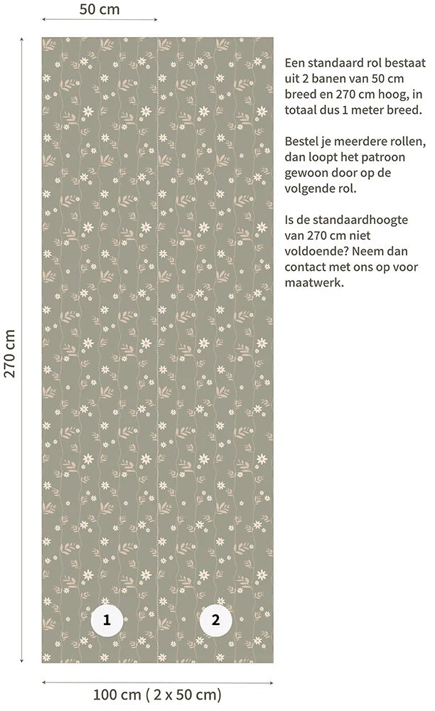 Je bestelt het Little Amour behang per rol. Deze bevat twee banen behang van 50 x 270cm, dus een totale breedte van 100cm met een hoogte van 270cm. Heb je een hogere muur dan de standaard maten? Neem dan contact met ons op voor een prijs op maat.