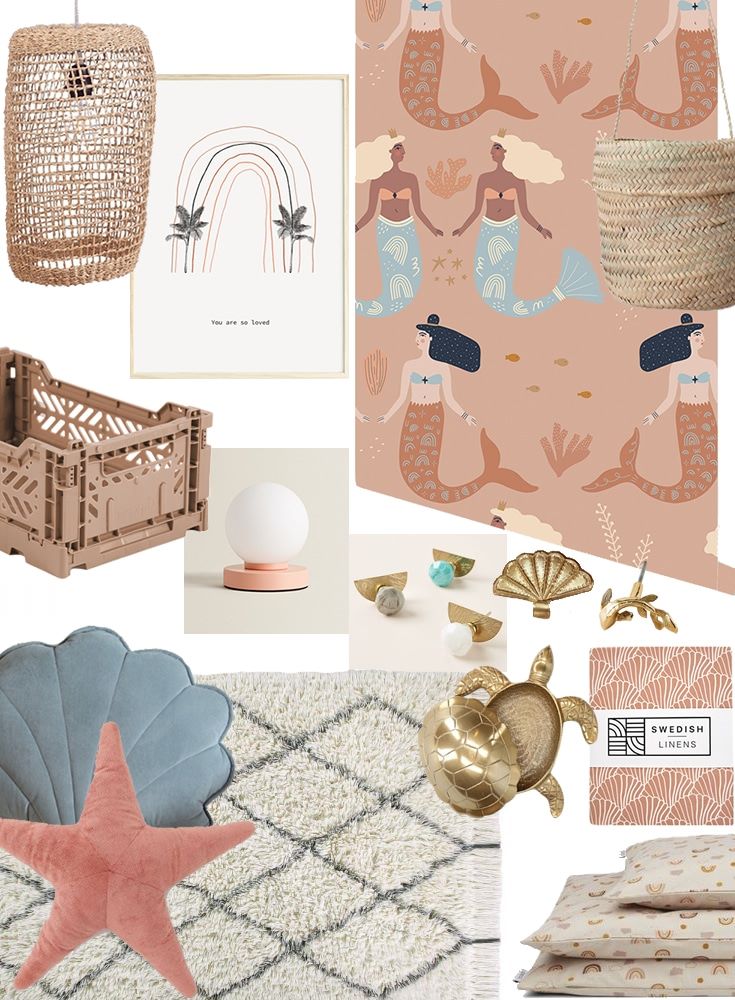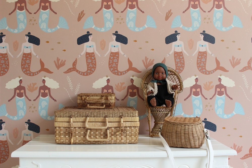Mermazing van May and Fay is een echte topper voor de meisjeskamer! De vrolijke zeemeerminnen print heeft beige, blauwe en bruine accenten op een terra kleurige achtergrond. Combineer het behang met leuke accessoires in deze kleuren en je hebt een super leuke gestylde kinderkamer!