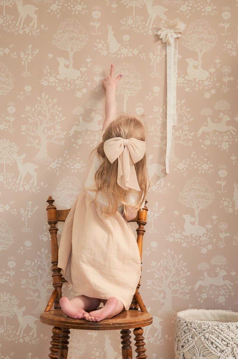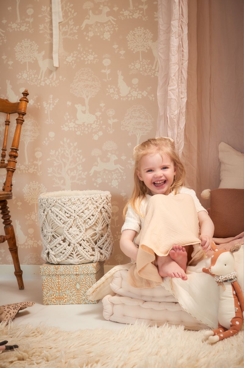 The powder pink wallpaper has a warm powder pink background, with the print in an off white uni color to keep it calm. Combine this beautiful Summer Fields wallpaper with rattan or wooden furniture for a warm effect or with off white for a quiet children's room.