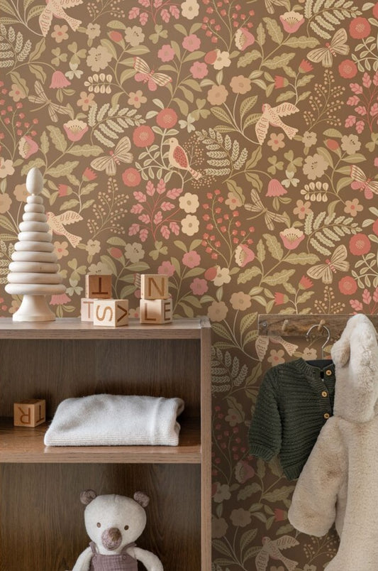 ESTAhome Wallpaper Flowers and Birds - Grayish Green Pink