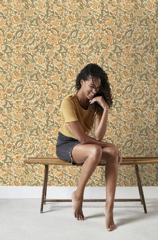 ESTAhome Wallpaper Vintage Flowers Paisley - Yellow Green