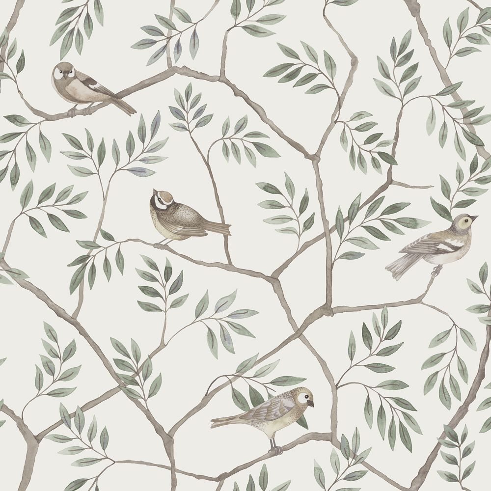 Hear the cheerful song of the birds as the sun rises on a beautiful spring day! August is a beautiful wallpaper print with birds, resting on twigs to prepare for another beautiful new day. The cream-colored background is a nice base for a neutral children's room, together with the green, brown and gray accents.