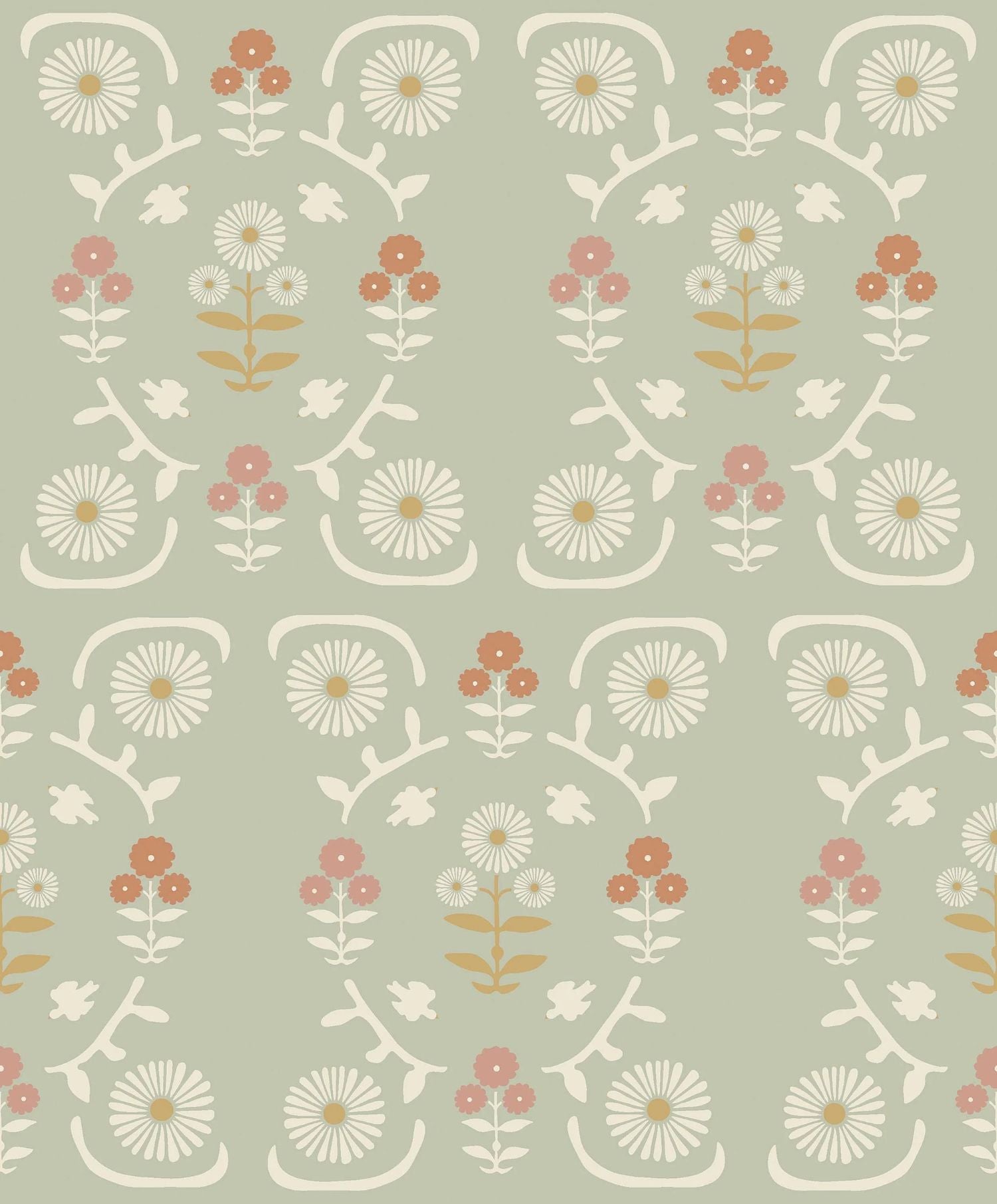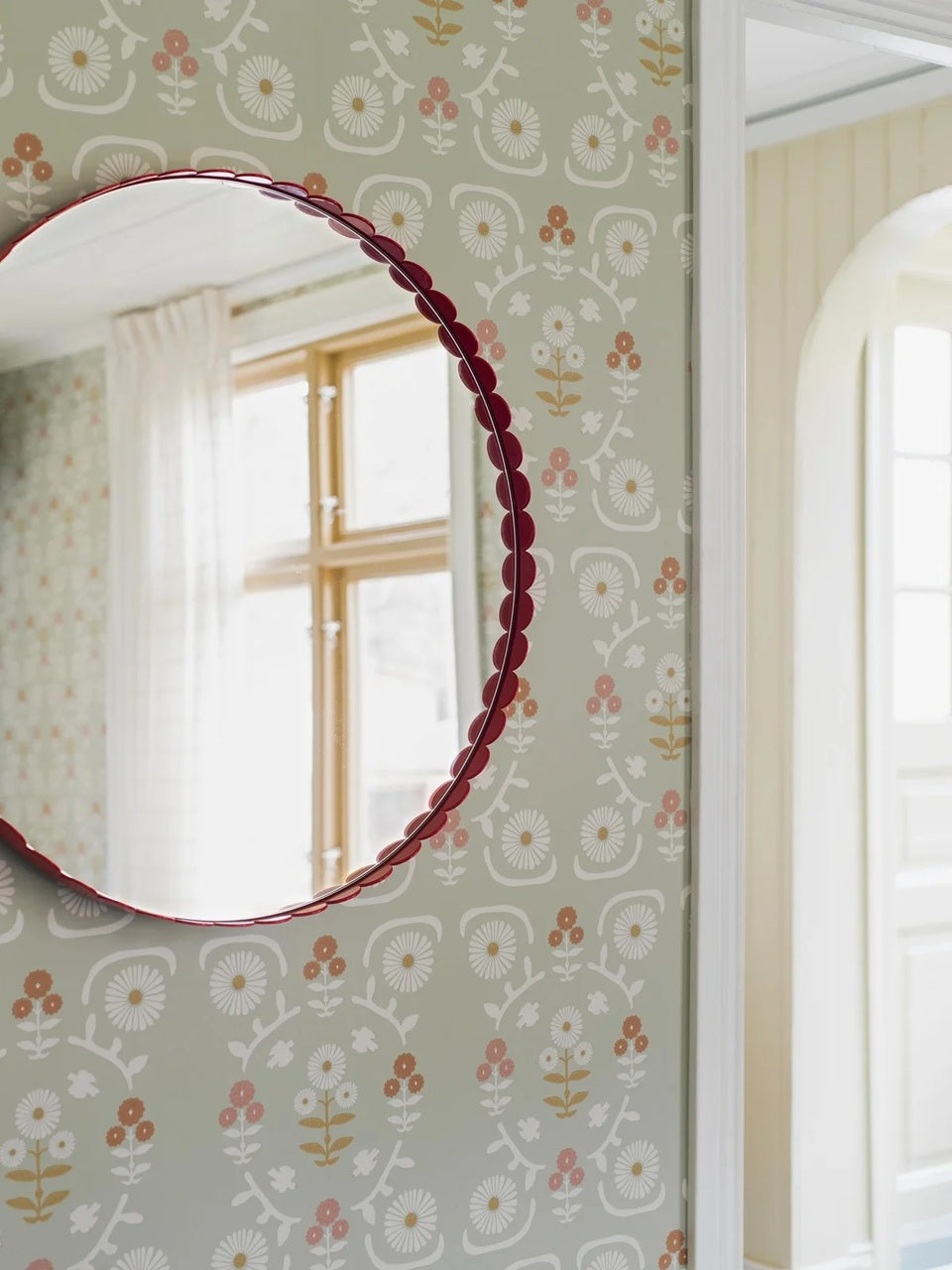 Isolde by Boråstapeter is a cheerful wallpaper for a child's room! The grayish-light green color creates a lovely base for the room, with details in pink, rust, and ochre yellow. The print is based on old folklore medallion patterns, beautifully symmetrical.
